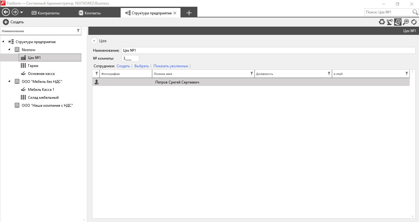 Структура предприятия в системе Fastkore.Business отображается в виде дерева и предназначена для отображения полной структуры компании.